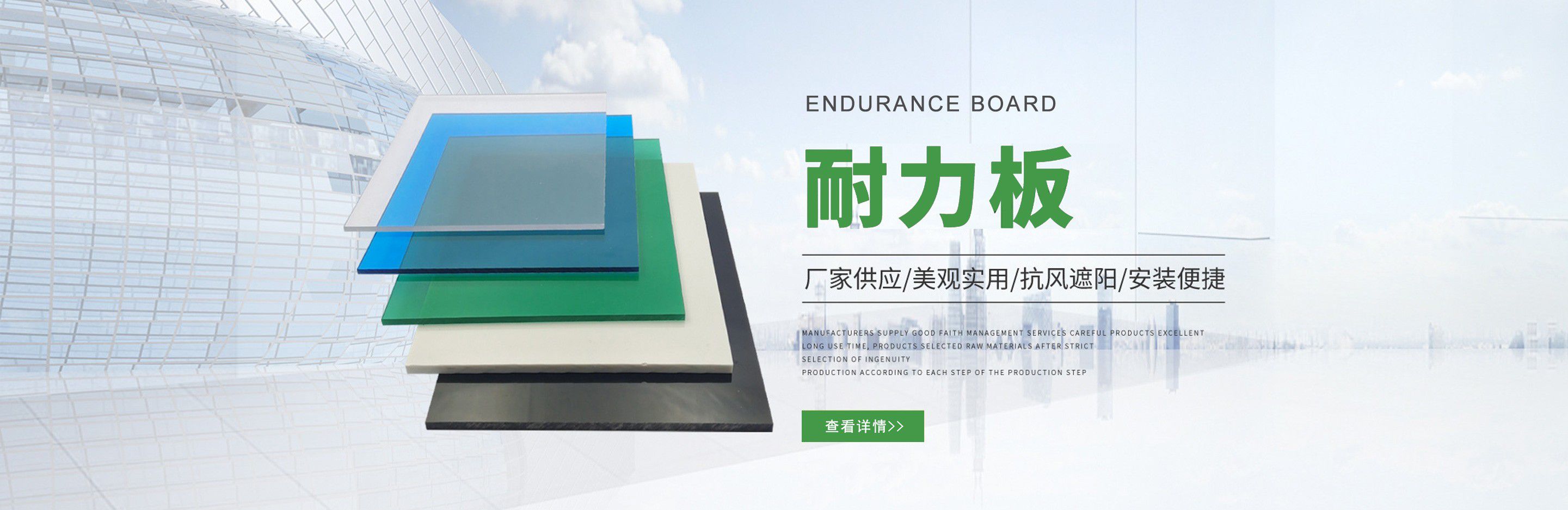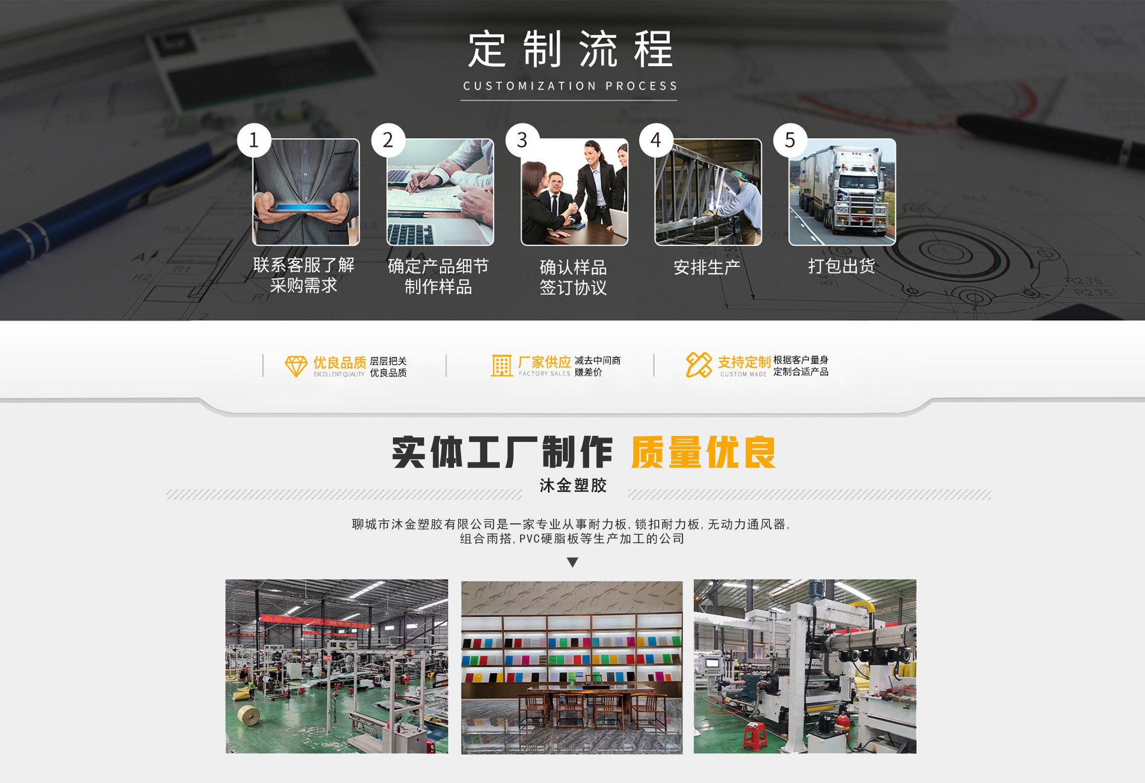 聊城市沐金塑膠有限公司注冊資金2180萬元,占地20000余平方,擁有自建廠房15000平方,員工100余名。10余年來,公司主營耐力板,鎖扣耐力板,耐力板深加工,無動力通風器,組合雨搭,PVC硬脂板,耐力板廠家等板材的發展戰略,逐漸成長為綜合性企業?! 」緭碛卸鄺l板材共擠生產線,采用世界知名品牌進口原材料和先進工藝,依據完善的ISO9001質量管理體系和ISO14001環境管理體系,為產品的卓越品質提供了強有力的保證。憑借過硬的創新能力和堅實的硬件基礎,贏創已成為國內領先的熱塑性板材生產商,產品被廣泛應用于建筑業、農業、工業、廣告業、安防行業及DIY領域。 公司始終致力于通過提供最優的板材應用解決方案,為客戶創造最高的價值;堅守創新、質量、靈活、服務和速度的核心價值觀;堅持“完美的產品需要完美服務的支持”的經營理念,努力實現成為世界領先的板材與解決方案供應商的夢想?! ≡谖磥?,公司將立足客戶需求,不斷改變和完善現有產品,拓展產品線和充分開發板材的應用領域,為客戶創造全方位的價值。同時更好地實現員工的價值,實現公司團隊的價值。我們將與您一起創贏未來! 企業使命:成為世界領先的板材與解決方案供應商?! 」驹妇埃和ㄟ^提供最優的板材應用解決方案,為客戶創造最高的價值?! 『诵膬r值觀:質量...